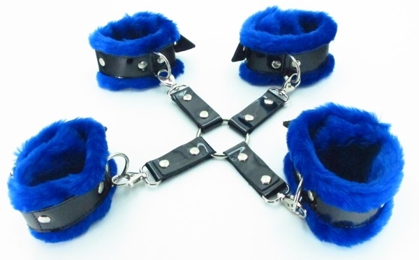 Выпол­нены наруч­ники и нанож­ники из иску­ствен­ного меха в королевском синем цвете с чер­ными лако­выми рем­нями. Иде­альны для самых страст­ных и жар­ких ласк, т.к. не остав­ляют сса­дин и царапин на запя­стьях. Застеги­ваются при помощи ремешка и регу­ли­руются на любой размер