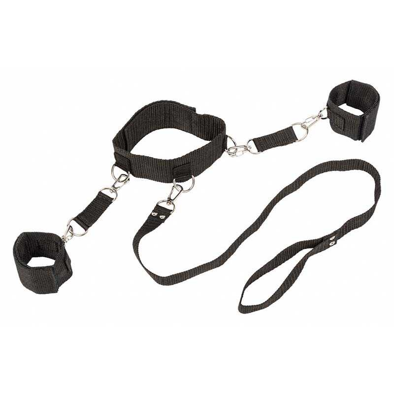 Фик­сация состоит из мяг­ких тканевых наруч­ни­ков и ошей­ника с поводком. Вы можете зафик­си­ро­вать руки Вашего парт­нера на шее, а можете перестегнуть карабины, куда пожелаете!