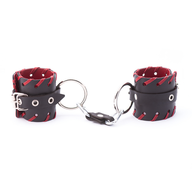 Выполнены оковы из натуральной кожи в черном цвете и декорированы красной плетеной окантовкой и металлическими клепками