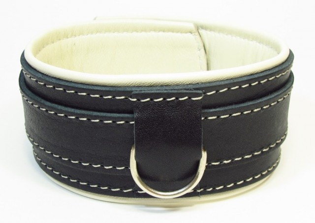 Снаружи ошей­ник выполнен из натуральной толстой ременной кожи черного цвета, декорирован контрастной грубой строчкой бежевого цвета, выглядит невероятно провокационно, как на нежной женской шейке, так и на мужской!
