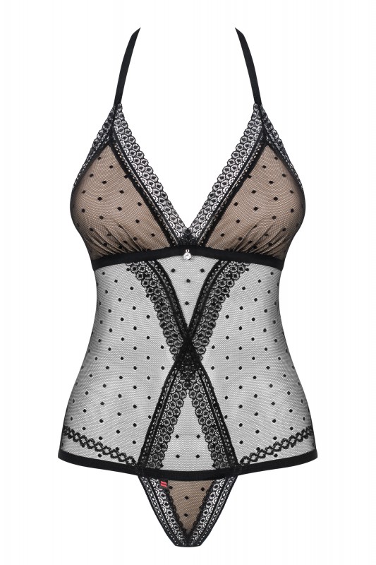Глубокое декольте с кристаллом на ложбинке акцентирует внимание на бюсте, а низ боди в виде трусиков стринг с двойным пояском привлекает внимание к ягодицам